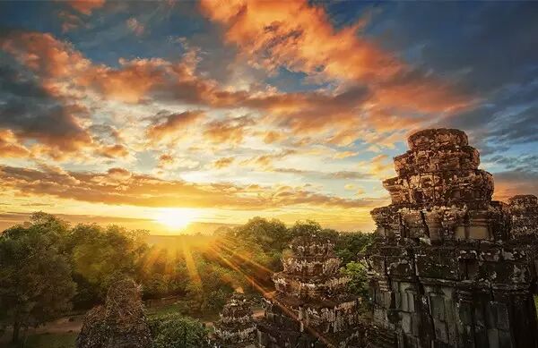 当地风情:柬埔寨处处皆风景:耸入云霄的棕榈树、农家赶牛羊的耕作场面、就此取材而搭建的高脚茅草屋,小商小贩的摊上数不尽的丰盛水果,暹粒城中散落的被古王朝废弃的吴哥城堡,开到荼靡的酒吧间……