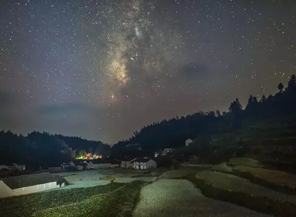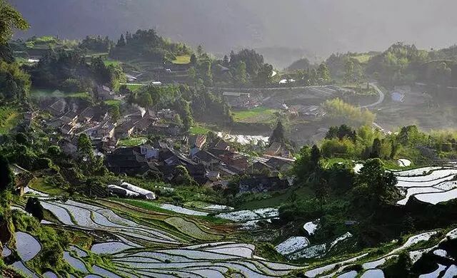 涓涓细流像一条柔软白丝带,萦绕在梯田中,缠绕在村子里,与斑驳的黄土墙,褐色的石块路,黑色的瓦,长满青苔的石墙,相互掩映,浑然天成,构成一幅完美和谐的田园山水图。