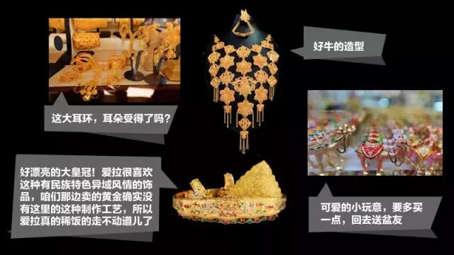 “爱拉真的好喜欢这里很有异域风情的金饰呢~在这里买金饰一定要记得还价,虽然砍下来的不会很多,但也要记得砍哦~”