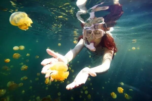 帕劳水母湖的神奇之处是你可以无限近距离与这些可爱的小生命接触。完全不必像在别处大海中看到水母时,惊慌游走以免被蜇,在水母湖中,你可以慢慢的游泳,和他们嬉戏合影。