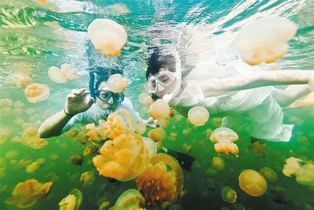 水母湖中的大多数海洋生物都随着养分的消耗而消亡,唯独留下了数量巨多的水母。失去了天敌,水母都退化成了无毒。这就是世界上独一无二的帕劳无毒水母湖。