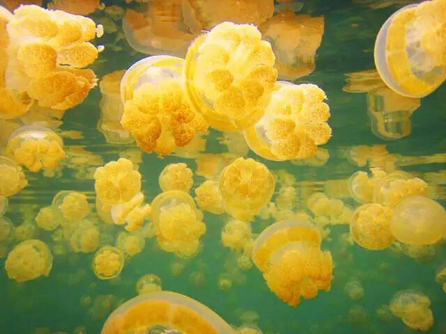 最适合看水母的时间是中午,这个时候水母都会浮到水面上进行光合作用。一眼望去,湖面上全是密密麻麻的水母,橘色的水母,在阳光下一闪一闪分外好看。