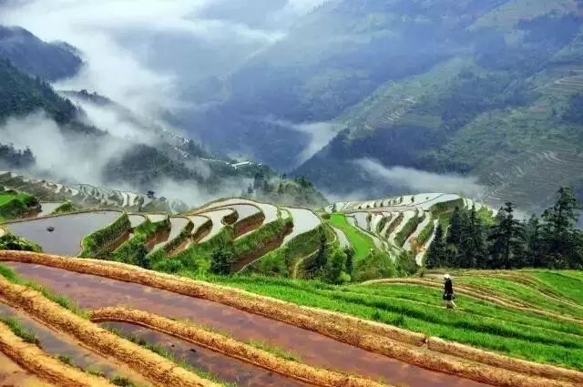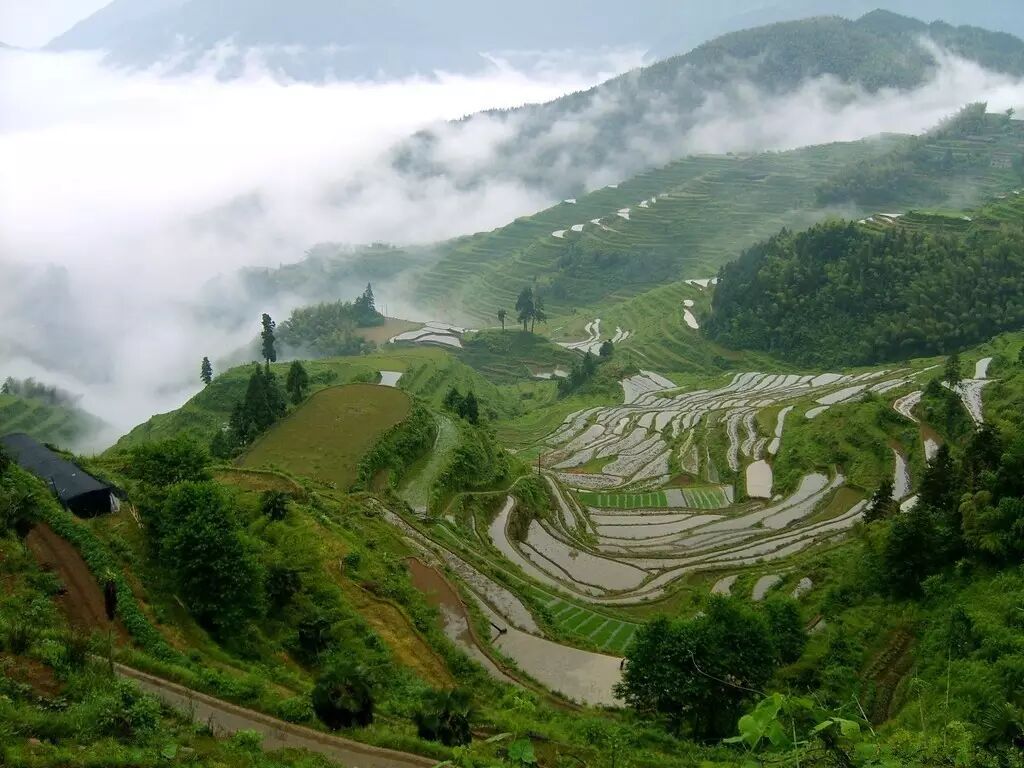 云和的梯田乍看似无序的曲线,田块的形状没有相似的,草色花色水色天色没有凝固的,景随步移逐渐变化,泥房炊烟、耕牛犁田、牧童短笛……
