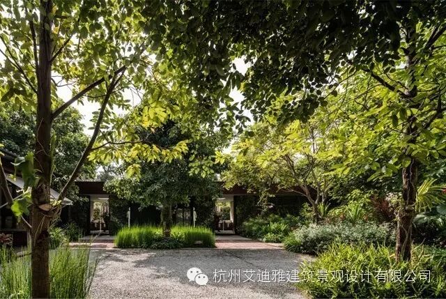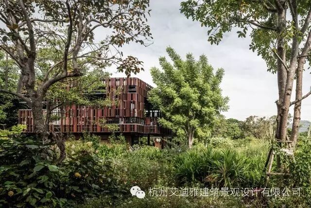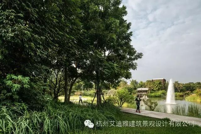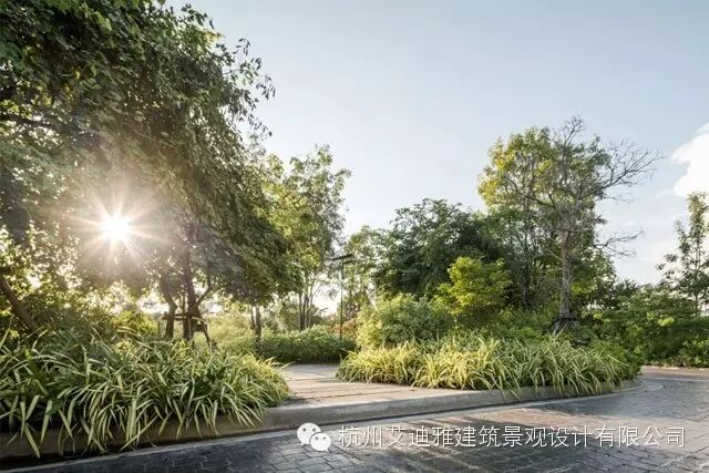 景观设计师保留了基地上的原生树木,同时因地制宜,采用了泰国典型的平面布置形式,建筑环绕广场而建,广场可不时承办当地的市集,塑造出极富当地的乡土特色的公园氛围。