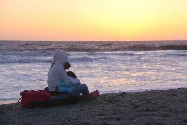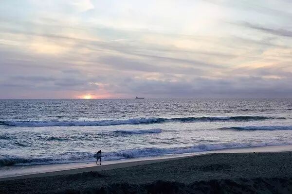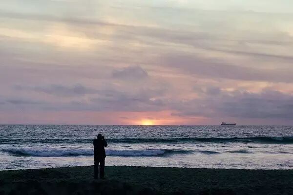 即使如此,冲浪者们从海里上来,沙滩上的老人也掏出了相机,这一刻,人们都望着西边日落的尽头,专注而安静。