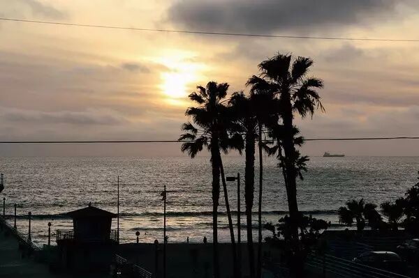 下午4点多才在机场附近的租车点拿到车,免不了撞上洛杉矶下午堵车的早高峰,我们依然在日落之前赶到了曼哈顿海滩(Manhattan Beach)。停了车,从高处眺望,斜阳已快落到了高高的棕榈树后,阳光映在豁然开朗的海面上,波光粼粼。