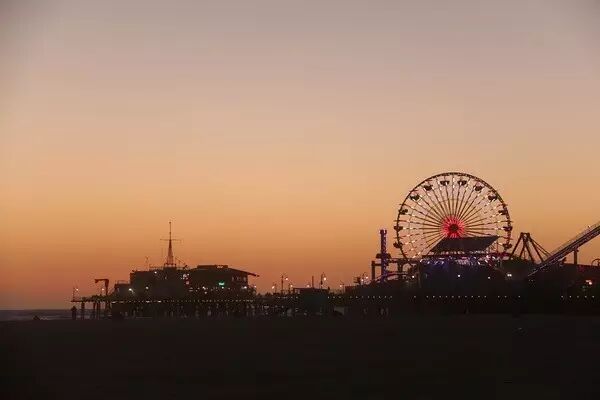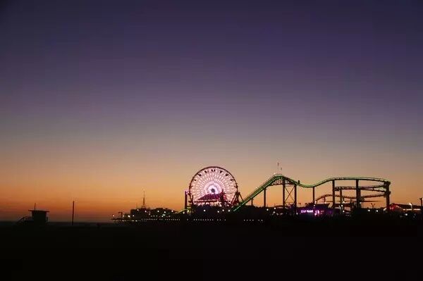 日落之后,天就黑得快了。很快天边只剩一带浅红的余晖。而圣莫妮卡码头上的摩天轮和过山车渐渐亮起来,就像是曼哈顿海滩的栈桥,和Terranea Bluff Top Park的灯塔一样,在越来越暗的海天间给我们一些新鲜而迷人的光亮。