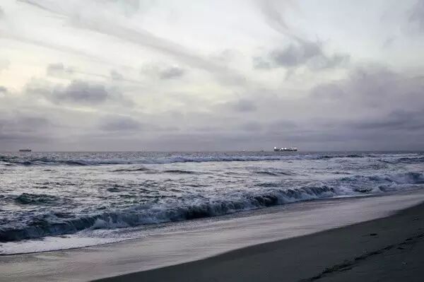 努力走到水边,风虽依旧大,沙终于好了些。远眺北边的圣莫妮卡码头,码头和栈桥都被包裹在了大浪里,映衬着背景里的圣莫妮卡山脉的轮廓,在黄昏时分,有种我们上回旅行时完全不曾领略的味道。