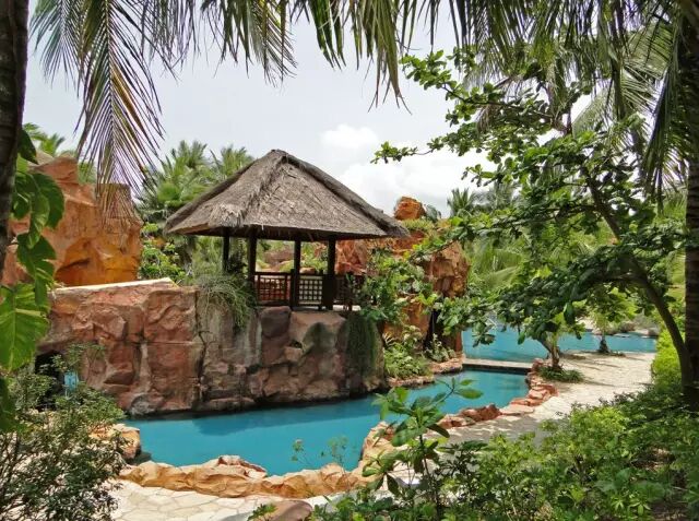 温泉处处都有,但是置身于椰树下的温泉泡池是三亚温泉的独特之处。温泉园区内有大概50种不同的露天温泉泡池。在四周椰树的环绕下,一潭碧绿色的温泉,周围弥漫的是无尽的花香,仰望椰树中点点遗漏的阳光、蓝天和心爱的人相伴,聊着无尽的情话密语,恍如世外桃源