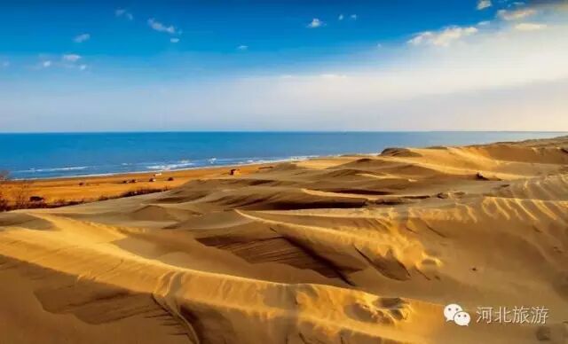 沙质松软,色黄如金,故称黄金海岸。这里海水洁净,沙粒匀细,由于海潮季风的作用,在海岸沿线形成世界罕见的大沙丘,高度达30-40米。这些金黄色的沙丘呈新月形,陡缓交错,起伏有序,线条流畅,造型优美,形成独特的海洋沙漠风光,景色极为壮观。