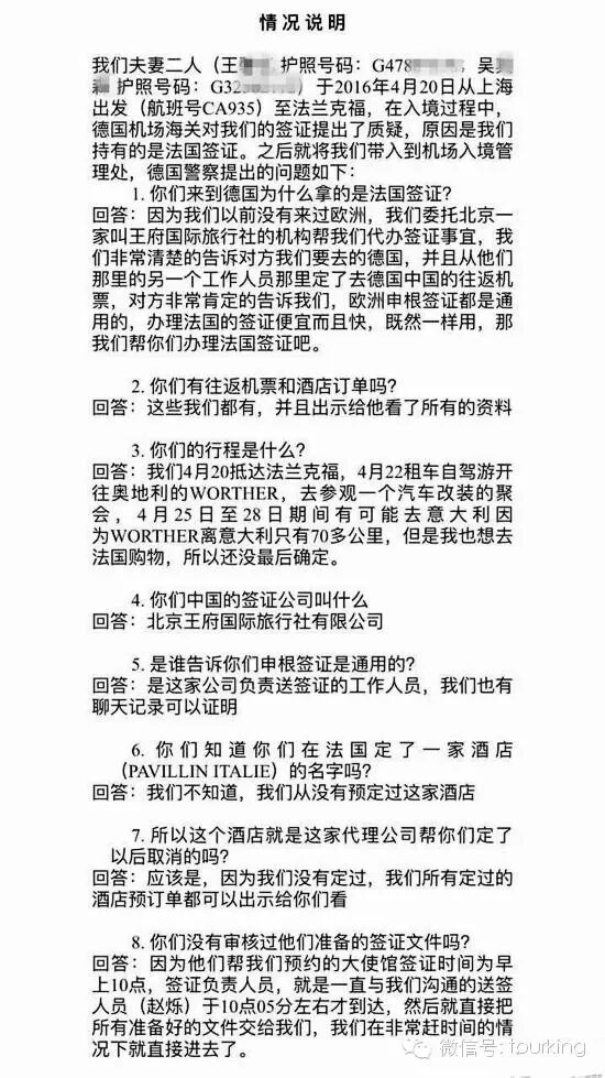 德国之旅被遣返的原因 今年2月,王女士向旅行社方面提出办理去德国的相关签证手续。恰巧王女士的朋友也在该旅行社上班,并帮忙找到了王府国际旅行社签证部经理赵铄。赵铄告诉王女士“申根签证是百分之百能进的,二十六个国家,拿着一国签证可以到任何一个国家,包括可以旅行,可以打工。于是王女士通过该旅行社的员工购买了往返机票。 为什么持法国签证入境德国会被遣返? 据王女士夫妇回忆,德国警方首先问他们到德国为什么拿到的是法国签证?王女士回答所旅行社已经肯定签证在申根国家是通用的,且办理法国签证便宜且速度快。接下来德国警方问他们的行程是什么?王女士说,主要的行程是德国和奥地利,有可能去意大利,也想去法国购物,但还没有确定。 德国警方分别给王女士和吴先生作了笔录,并没收了二人的护照,向他们出具了《拒绝入境通知书》,拒绝入境的原因翻译过来是“签证或居留许可无效”。“从法领馆获取签证所提供信息有误或不完整”、“该签证已被确认无效”。 王女士说,“我们就被告知,我们的行程跟法国一点关系都没有,我们甚至不知道有那个酒店,所以我们等于触犯了当地的刑法,持有无效的签证要入境,所以我们只能被遣送回国。” 欧洲26个申根国家可以为短期往返访问的外国人签发“申根国统一签证”,得到其中一国的申根签证,可前往其它申根国家访问。但是,也有这样的规定:“前往几个成员国,应申办主要访问成员国或停留时间最长的成员国的签证”。“只前往某一申根国家,应申办该国的签证”。“无法确定主访国时,应申办前往的第一个申根国的签证”。也就是说,德国警方可能判断王女士此行主要行程是在德国,就应该办理德国签证。国家旅游局也表示:去德国游玩不能通用法国签证。 该签证部经理:个人行为拒赔偿