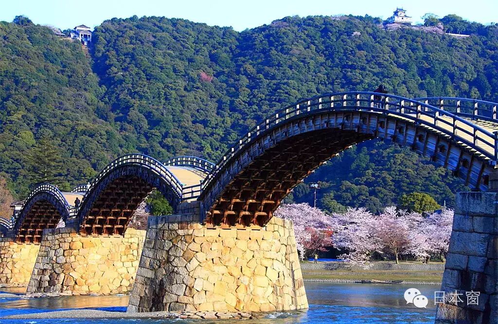 锦带桥是一座横跨锦川的五拱桥,被列为日本三大名桥之一,同时也是山口县的地标性建筑,木桥采用金属包带与锔子的“组木技法”。其秀美的丰姿映在锦河清清的流水与城山的绿色中,优美无比。