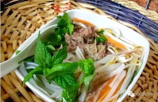 Pho (越南河粉):这种小吃中加入了芳香草本植物,包括胡荽和薄荷。其米粉清汤的特点是有切成细丝的半熟的牛肉和其他多达24种的配料。