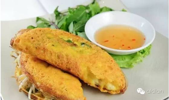 Banh xeo:这是胡志明市的一种街边特色小吃。在顺化被叫做banh khoai,非常有名。这种薄脆饼中卷有细条的猪肉、 虾仁、蘑菇和其他蔬菜。