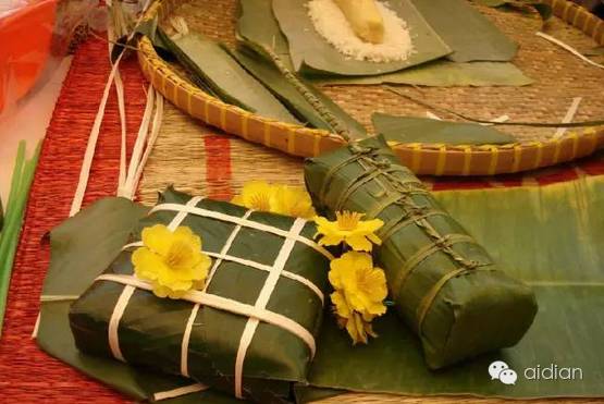 Banh Chung:这是一种把糯米、豆腐和猪肉包裹在香蕉叶中并要制作整整一晚的方形食物。它是越南春节不可缺少的一部分,就像火鸡是感恩节不可缺少的一部分一样。