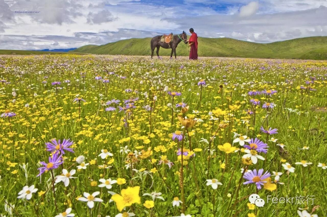 如果觉得极目之处都是油绿的草原过于单调,那么这片被五彩花海覆盖的草原,一定会让你迷醉在芬芳世界里。湛蓝的天空,草原之际的雪峰带,空旷广阔的草原,还有那五彩斑斓的浩瀚花海,得仙境如此,旅途的疲惫顿时被这满世界的芬芳拂洗而去了。入夜后在花海从中搭一顶帐篷,与友人烤着篝火,被馥郁的海洋包裹,万千闪烁的银星缀满天幕,如此花海仙境何处可再觅!