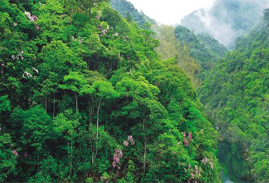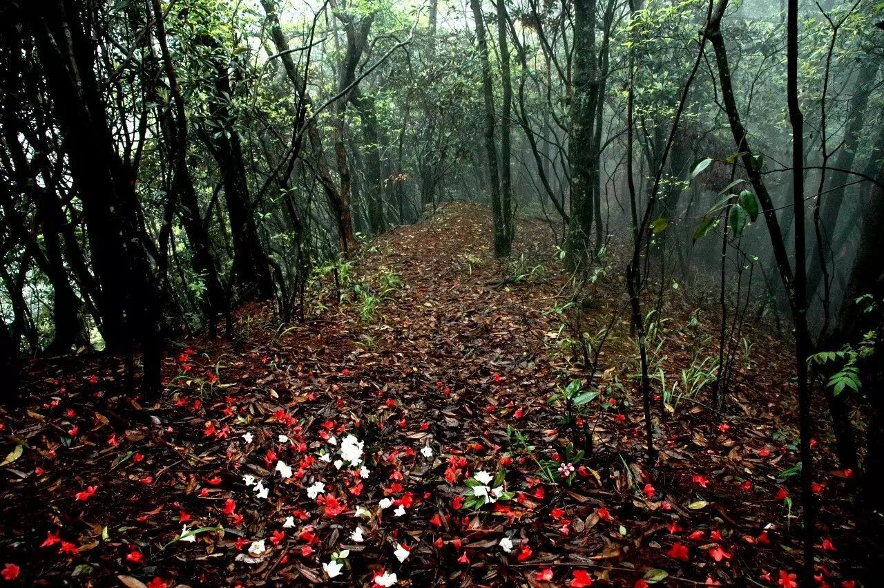 这是一片高山上的原始森林,掩映在绿树繁花之中,没有任何雕凿的天然之地,受到大自然的无比庇护。草色青葱,蝶舞蜂飞,十里笼翠,流绿滴翠,仿佛是一道古意幽深的画廊,逶迤曲折,盘绕于深山,一步一景,引人入胜。小憩于山间石径,尽情领略大自然的神韵,古木翠杉之中,偶有野生灵猫闪过,耳边传来声声鸟鸣,彩蝶在眼前翻飞,此情此景,犹如置身虚幻之境,引起人们无尽的遐想。