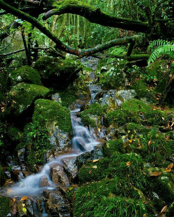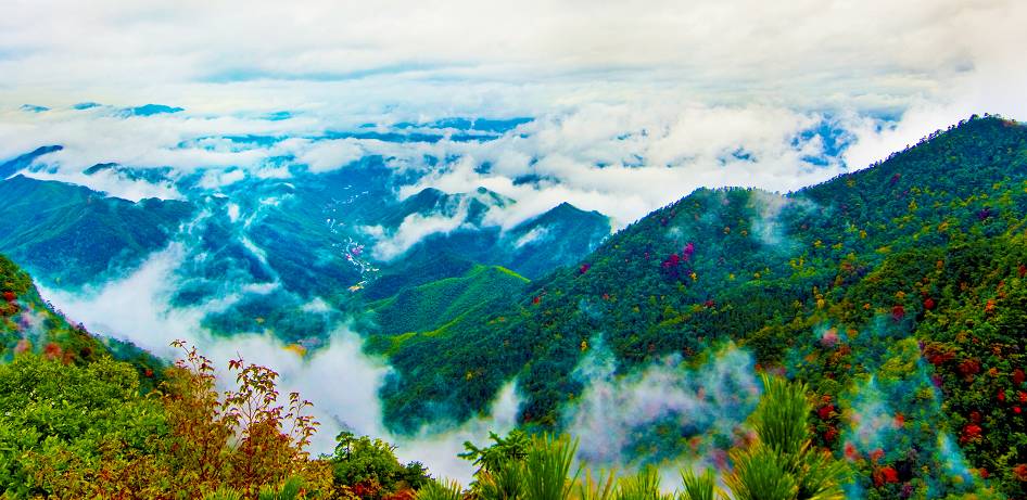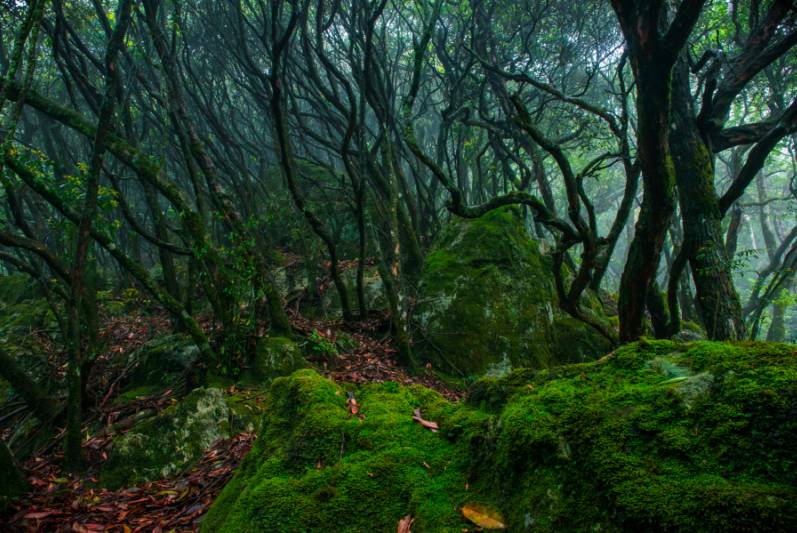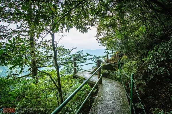 数百上千的珍贵原始天然林,云雾涌来,淹没在茫茫“云海”之中,摇身一变,恍然成了一片华盖如云的“海底森林”。踏进这片原始森林,各种奇特景观便映入眼帘,令人目不暇接。山道上,铺着厚厚的一层落叶,柔软且细密,岩壁上苔藓地衣密布,树木葱郁苍劲,藤蔓缠绕而上,有些枯死的树木和树桩上还附生着菌类生物。古木参天的密林深处,隐藏着数不尽的奇石异岩,溪流瀑布错落其间。有人说这里是最“幽暗”的原始森林,步入其中,仿佛闯入爱丽丝的那片梦游仙境。