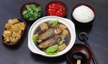 这道美食用药材、大蒜和香料,加上猪肉骨烹煮而成,食用时配以米饭和辣椒黑酱油。它是大众的早餐和夜宵。去新加坡,要想吃到原汁原味的肉骨茶,应该去唐人街牛车水的大排挡。茶客入座,店主便端上热气腾腾的大碗鲜汤,碗中有五六块排骨,加一碗香喷喷的白米饭,还有一盘切成寸把长的油条。吃完一大碗肉骨,接着是一小盅潮州的功夫茶,茶杯极小,泡的是很浓微带苦味的普洱茶,而喝起来却是滋味浓醇,馨香入肺。