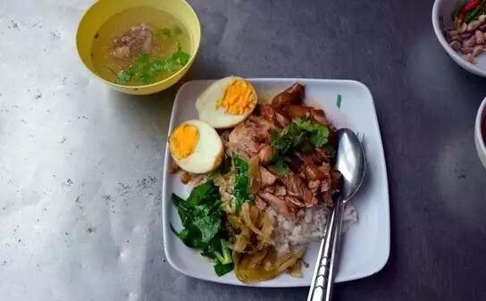迫不及待的点单,淳朴的老板娘端上猪脚饭,切了一个蛋,有些许蔬菜,配了一碗汤,恰到好处,只想说遇上带给人美味幸福感的食物,绝不是一种偶然,更像是种命运。