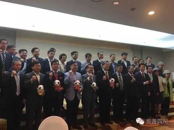 推介会最后,与会主要贵宾们手持熊猫,站立在主席台,并用韩国最豪迈雄壮的方式为四川旅游的圆满推介握拳助威以及齐声高呼“fighting(加油)”,四川旅游在韩国首尔发出了最强之音!
