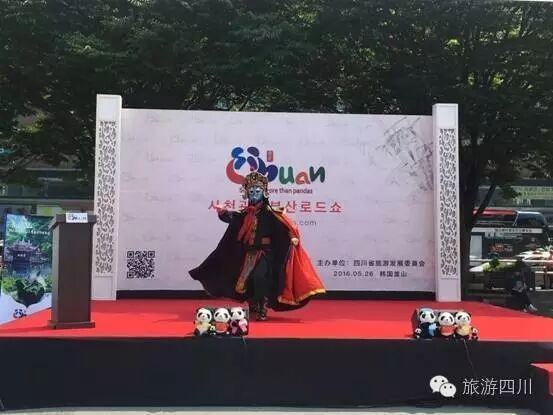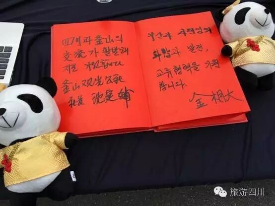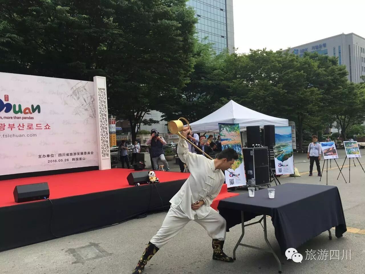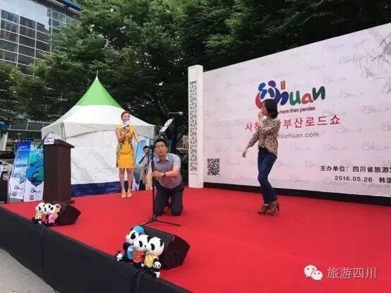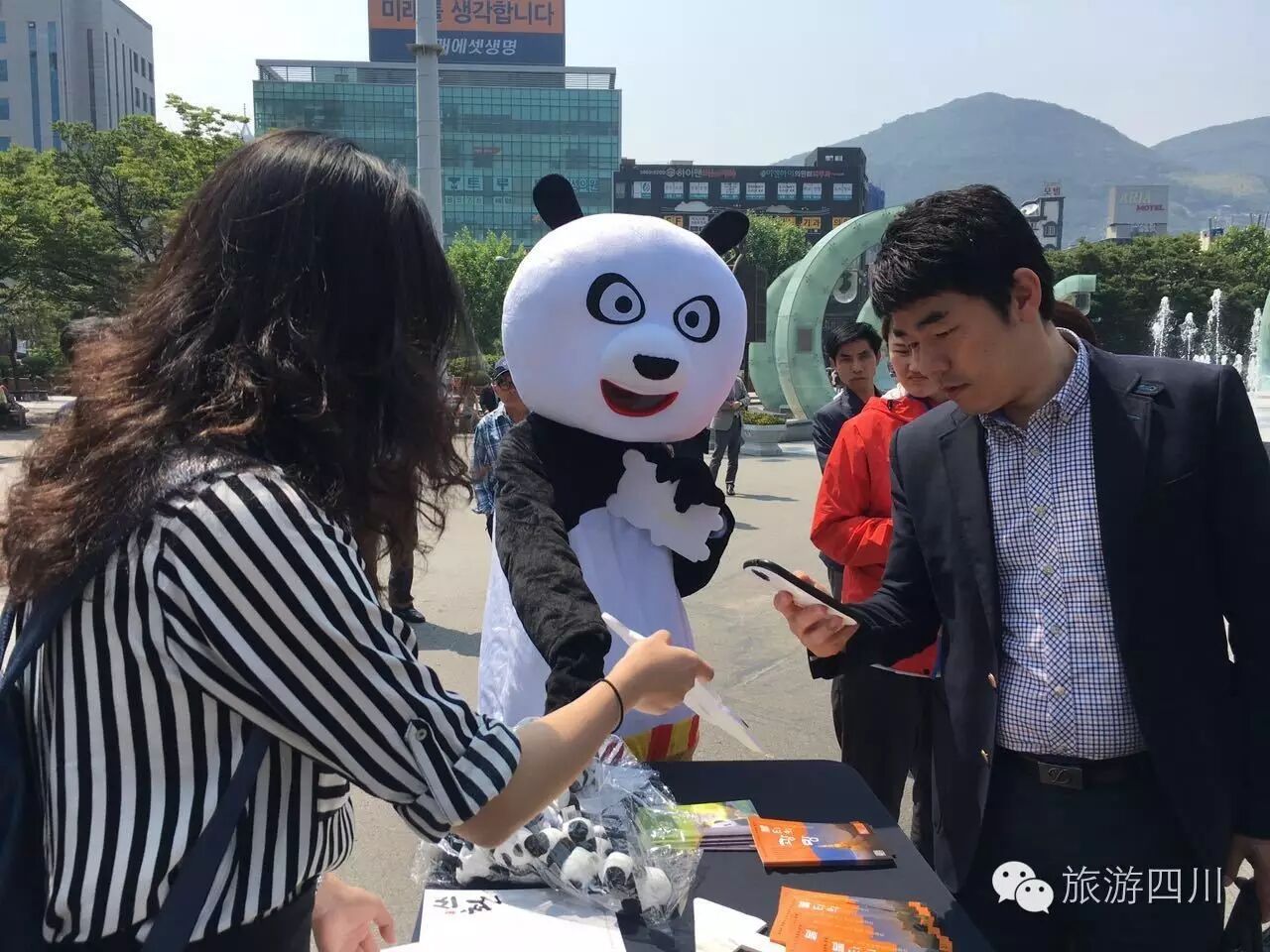 原来,这里正是四川旅游宣传团在釜山推介四川旅游的路演现场~胖哒哥带你萌走近看看,细节处那可是处处用心呢!