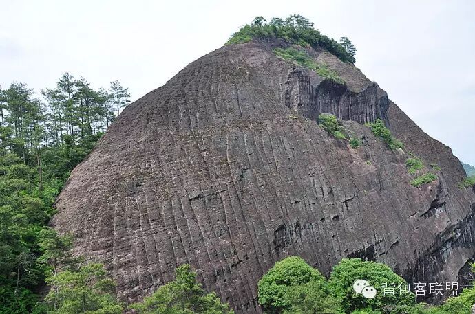 大王峰又称纱帽岩、天柱峰,因山形如宦者纱帽,独具王者威仪而得名。位万年宫西侧,雄跨九曲溪口,是进入武夷山的第一峰。上丰下敛,气势磅礴,远远望去,宛如擎天巨柱,在武夷三十六峰中,向有“仙壑王”之称。峰顶古木参天,有天鉴池、投龙洞、仙鹤岩、升真观遗址诸胜。南壁悬崖峭壁,仅南壁一条狭小的孔道,可供登临峰巅。这是一条直上直下的裂罅,宽仅尺许,中凿石级,可拾级盘旋而上。裂罅越高越窄,有的地方登临者需侧身缩腹,手足并用而过。峰腰有张仙岩,相传是汉代张垓坐化之处。有天鉴池,池水极清沏,虽旱不竭。池上流泉名“寒碧泉”。池侧为宋羽士林文能结庐处。从这里再升一梯,有升真观故址。从观左拾级而上,则为通天台。再往上登数十步,便到了大王峰顶。