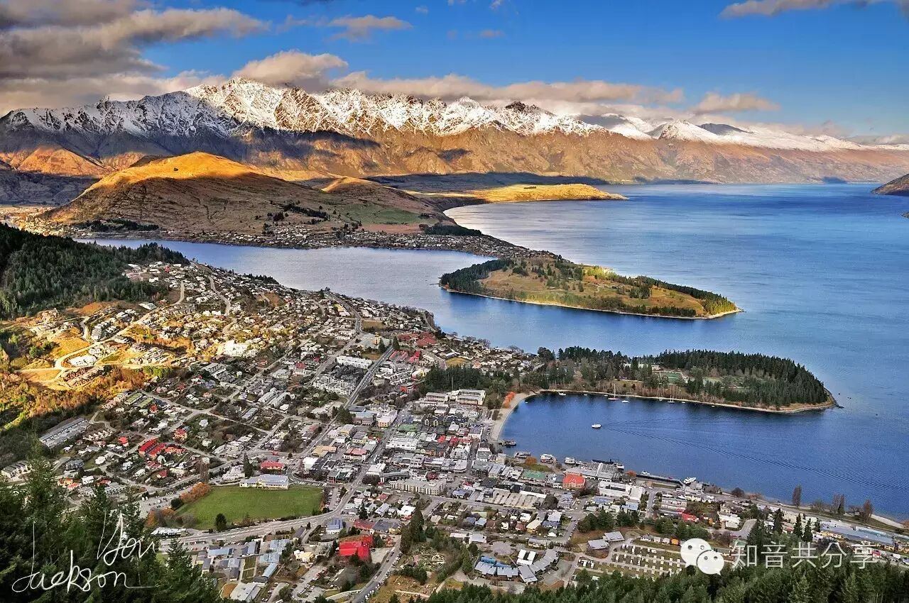 新西兰的皇后镇是一个被南阿尔卑斯山包围的美丽小镇,也是一个依山傍水的美丽城市。皇后镇全处都是完美的观光地点,夏季蓝天艳阳,秋季为鲜红与金黄的叶子染成缤纷多彩的面貌,冬天的气候清爽晴朗,还有大片覆着白雪的山岭,而春天又是百花盛开的日子。四季分明,各有着截然不同的面貌。市区附近的瓦卡蒂普湖(Lake Wakatipu)是座深而蓝的高山湖。壮丽的山脉上几座覆着白雪的绿棕色山点缀于背景中。从皇后镇到山顶,则是一片绿油油的色彩。皇后镇之名源于殖民者认为此处风景秀丽应属女王所有,由此得名皇后镇。