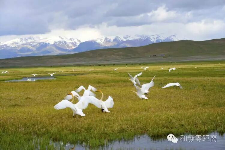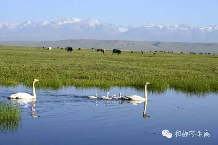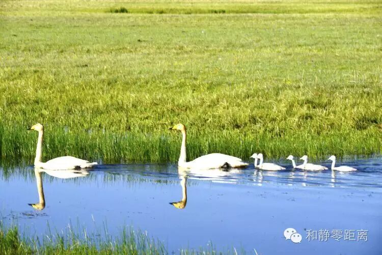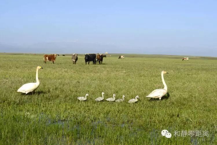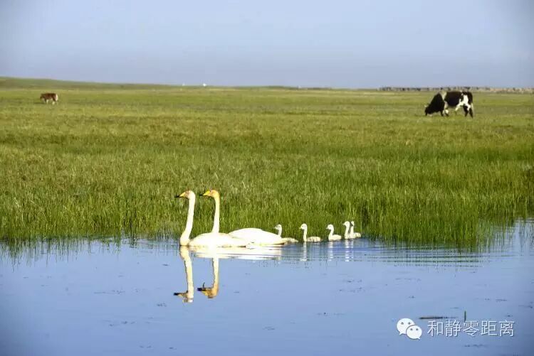 千里草原铺翡翠,天鹅与牛羊为伴,蓝天与草原为一线,你便会迷上这一优美惬意的风光。