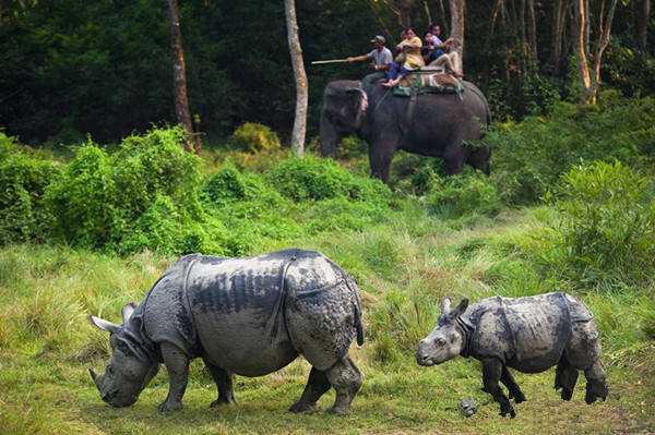 骑大象到处都有,但资深旅行家一定不会错过在尼泊尔骑大象!你不会只是乖乖呆在象背上穿过丛林,而是穿过雾气迷茫的真正热带丛林,越过沟坎,淌过溪流,去追逐犀牛群,找野猪、山鸡、猴子、麋鹿……看它们扬起尘土,把丛林震得嗡嗡响……你不是骑大象,而是成了大象的一部分!