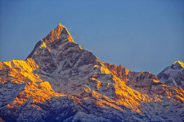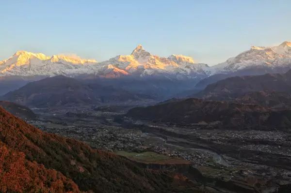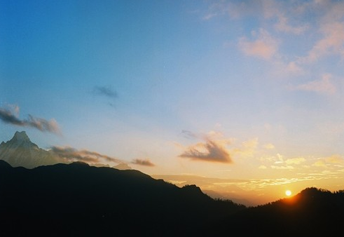 前往萨朗科山上观看雪山日出,眼前是庄严而寂静的安娜普娜山系和鱼尾峰,当太阳升起来,耀眼的光芒照在雪峰上形成金顶,绚丽无比。