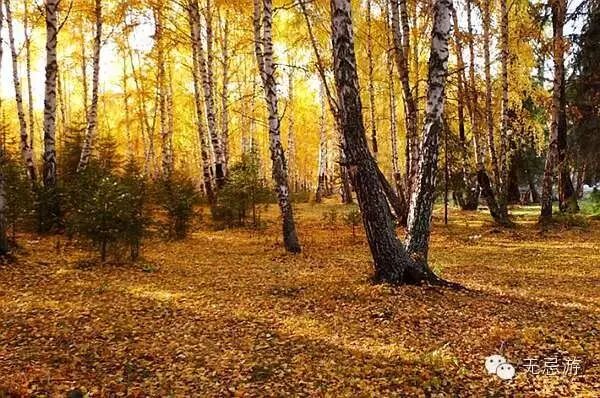 贾登峪的白桦林被誉为是拍特写的最佳主角。在友谊峰下,一排参天大树组成了一片围墙,树与树之间只留了两扇门大小的位置,其间的草地上铺满了黄色的落叶,在阳光下闪闪发亮,和蓝色的天空、白色的山峰正好搭配。