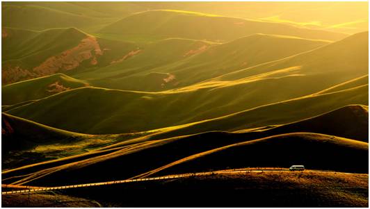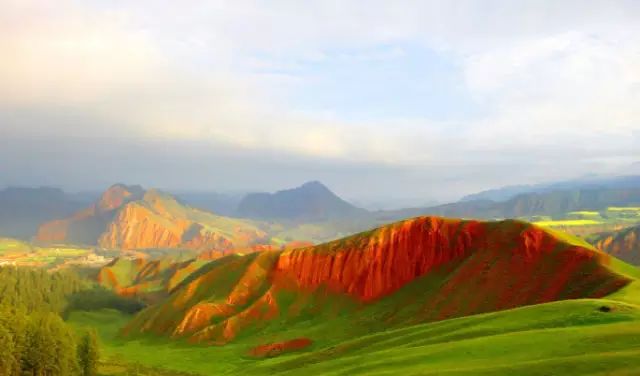 阳光下的卓尔山也闪烁着不同的色块,红色的山上布满了青青的绿草,但你不难发现这里的草绿得很有规律,绿得很有层次,仿佛你的心跳随着这些色块的变幻而跳动着。