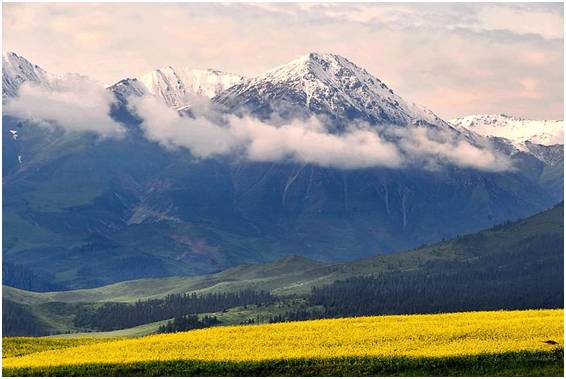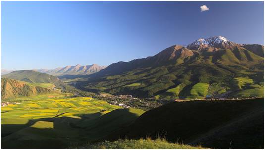 虽然是夏季,但与卓尔山互为情侣山的牛心山的山顶却是积雪终年不化;远处牛心山云里雾里的皑皑白雪与金黄的油菜花相辉映,美若仙境