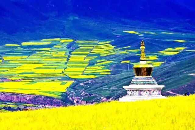 这里的天空蓝、雪山白、油菜黄、青草绿、丹霞红等待你的静赏