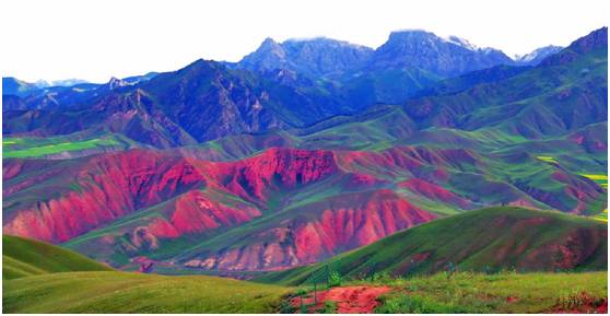 这座神山是彩色的:天空蓝、雪山白、油菜黄、青草绿、丹霞红,美得斑斓,美得词穷。此景只应天上有,天公作美留人间,它仿佛就是上帝遗落人间的又一个调色板。
