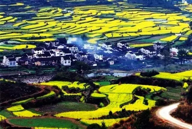 站在山顶望去,脚下大片的山谷内,油菜花层层叠叠,一望无际,中间围拢着几个小小的村落,黑瓦白墙的徽派民居夹杂在一片金黄之间,在婺源再没有比这更壮观而令人惊喜的了。