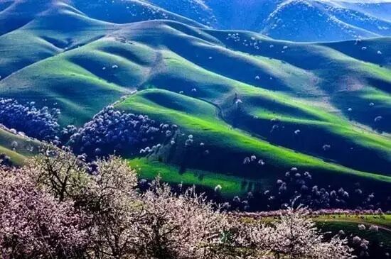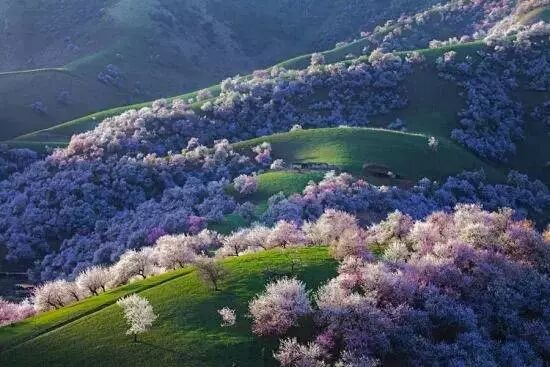 新疆新源县有一片中世纪遗留下来最大的原始野杏林,每年的4月10号到20号之间开花,花期一般在4-5天,早上日出时间8点,晚上落日20点30分左右。