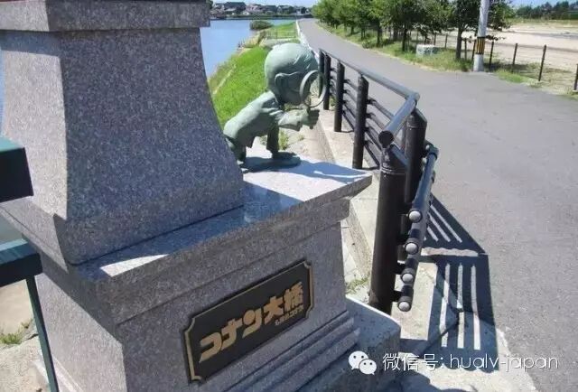 【柯南大桥】桥的两头各有两尊小柯南雕像,整座桥加上路灯共约有10个左右的柯南浮雕,据说不少皆为青山刚昌先生本人亲自监督完工。另外,在桥边上有一间不大的柯南侦探社商店,贩售柯南作品系列的相关产品。