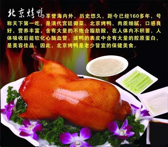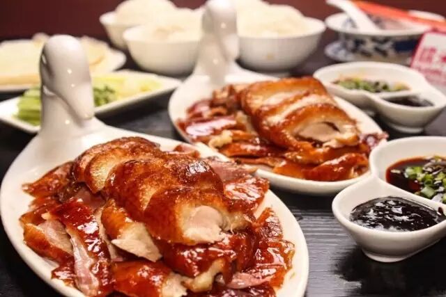 烤鸭是具有世界声誉的北京著名菜式,由中国汉族人研制于明朝,在当时是宫廷食品。用料为优质肉食鸭北京鸭,果木炭火烤制,色泽红润,肉质肥而不腻,外脆里嫩。北京烤鸭分为两大流派——挂炉烤鸭和焖炉烤鸭,而北京最著名的烤鸭店全聚德和便宜坊也即是两派的代表。它以色泽红艳,肉质细嫩,味道醇厚,肥而不腻的特色,被誉为“天下美味”。
