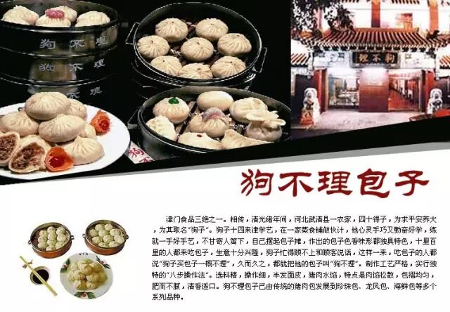 狗不理,即:狗不理包子。狗不理包子是天津市中国传统风味小吃,也是全国闻名的汉族特色传统风味小吃,始创于公元1858年(清朝咸丰年间),为“天津三绝”之首,是中华老字号之一。 狗不理包子的面、馅选料精细,制作工艺严格,外形美观,特别是包子褶花匀称,每个包子都不少于15个褶。刚出笼的包子,鲜而不腻,清香适口