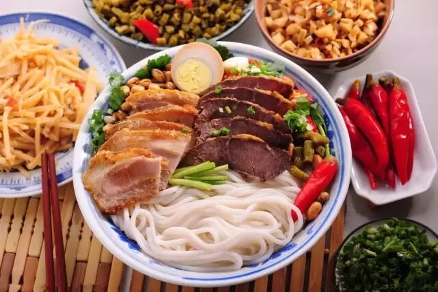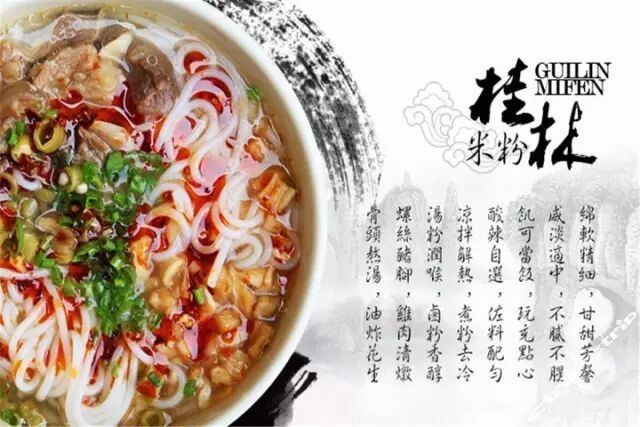 桂林米粉是历史悠久的小吃。以其独特的风味远近闻名。其做工考究,先将上好的早稻米磨成浆,装袋滤干,揣成粉团煮熟后压榨成圆根或片状即成。圆的称米粉,片状的称切粉,通称米粉,其特点是洁白、细嫩、软滑、爽口。其吃法多样。三味粉屋认为,制作最最讲究卤水的制作,其工艺各家有异,大致以猪、罗汉果和各式佐料熬煮而成,香味浓郁。卤水的用料和做法不同,米粉的风味也不同