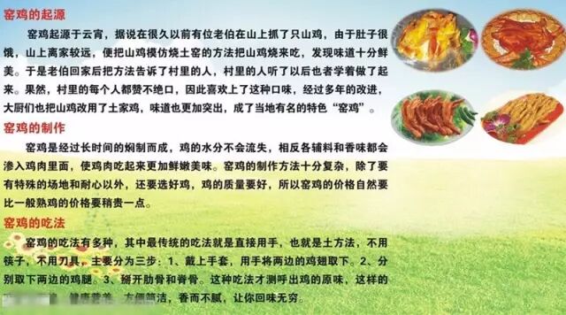 在周星驰的电影《美人鱼》中,林允和邓超因此定情的广式特色菜式——窑鸡,两人在戏中着迷得吃了十几只。所谓窑鸡,就是鸡的一种烹饪方式。往鸡肚子里塞进椰香四溢的五指毛桃、蒜头、香菇等佐料,鸡身内外都抹满精盐进行腌制,用水浸过的干荷叶包裹,再用锡纸包好放进烧好的窑里。等窑上的瓦片烧到泛白时熄灭柴火,将包好的鸡放进窑里后即把窑弄塌,在窑上覆一层厚厚的泥土或沙子防止热气散发。一小时左右就可以开窑取鸡了。只消稍微打开锡箔纸包一角,鸡肉的香味扑鼻而来。