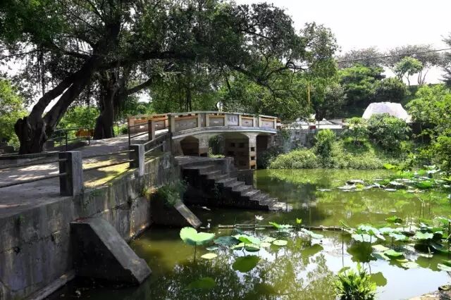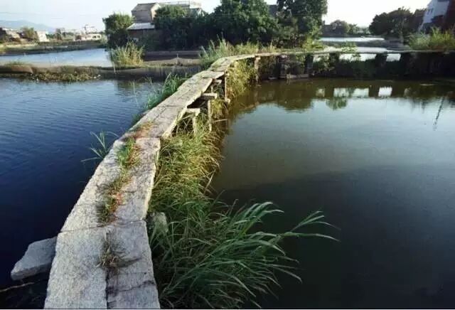 榕荫下,几块长条花岗岩石条曲曲折折地架在鱼塘边的木桩上,颇有一种“小桥流水人家”的韵味。这种花岗岩石条,当地人称它“条石”或“西樵石”。