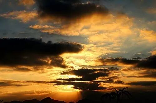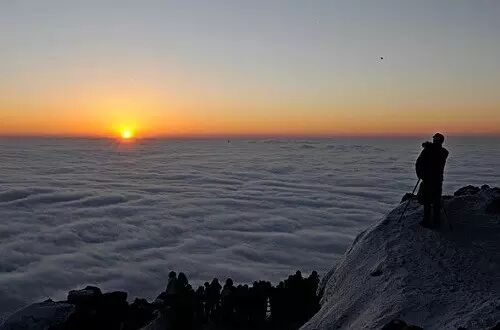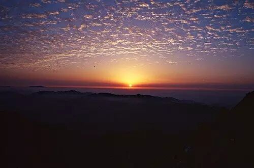 也许是因为峨眉山是佛山的缘故,人们在峨眉金顶观日出,心绪感受会与其他地方略有不同。同样是从云海边际的点点渲染开始,从一点紫红,到变成橘红再到金红,突然,一轮红日跳跃而出,瞬间朝霞满天。而当那一束霞光照在佛像的宝顶之上时,你会觉得有万丈祥光从金佛上反射而来,为整座峨眉甚至是云海都镶上了金边。