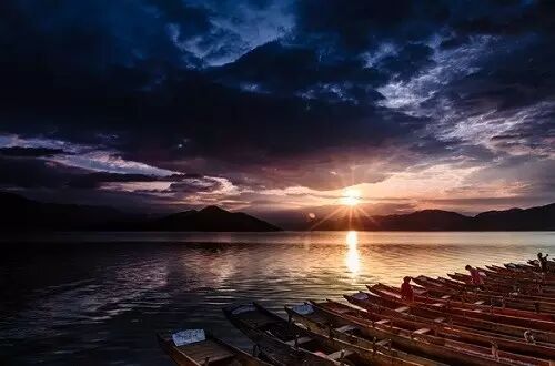 在高山之巅观到的日出总是雄伟壮阔居多,人们每每会在太阳出现的那一刹那产生无法抑制的兴奋与激动。而乘船在泸沽湖上看日出,感受又不一样了,在红霞浸染的那一刻,你也许会低声轻呼,天哪,世间怎会有如此柔情的时刻!整个天空就像是个五彩色盘,而太阳则是个娇羞的少女,慢慢地拨开霞云,轻轻为湖水披上一层金纱。此时,安静的湖面之上,一艘艘观景小船似乎也成了这人间仙境中的悠悠点缀。