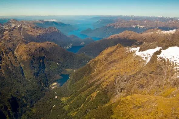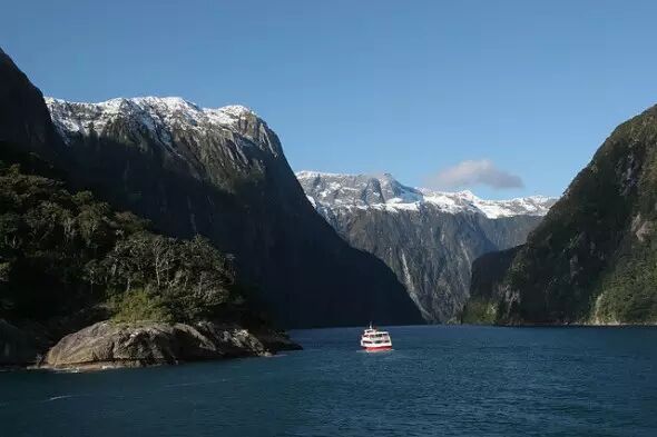 新西兰的所有峡湾中最简单而美丽的就是米尔福德峡湾,峡湾最深处与麦特尔峰(Mitre Peak)相差达265米。船行其中,不能不感叹人类的渺小和自然的壮观。峡湾地区的天气变幻莫测,据说在这里很难碰到晴朗的天气。