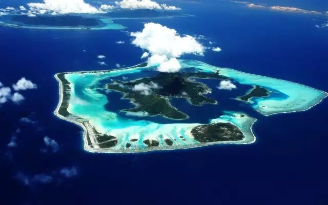 博拉博拉岛位于南太平洋东南部社会群岛中的背风群岛中央,光是从飞机上看就这么美!