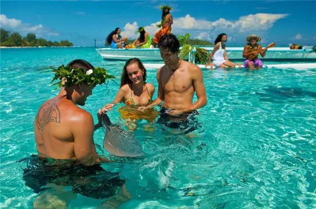 喂食鲨鱼和魟鱼是博拉博拉岛最著名的活动,光是想象那些长着尖牙的动物在身边游来游去,就觉得超刺激,更何况它们还要从你手里吃东西!