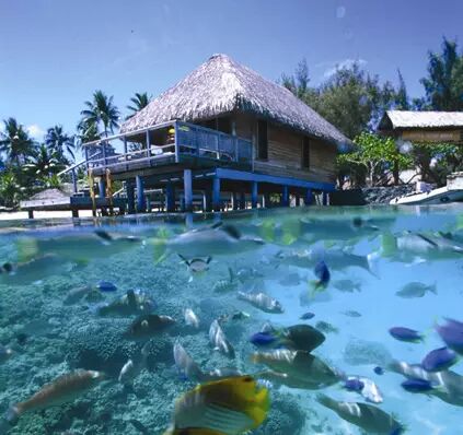 峻峭的山峰雄踞中央,周围则是由一条条沙坝连接珊瑚环堡礁,几乎是个完美圆形。在梦幻般的蓝色潟湖(Lagoon),充满了色彩斑斓的活珊瑚与无数环游其间的热带鱼,是世界级的知名潜水点。不会深潜也不怕,从酒店水上屋直接跃入水中,就能观赏到500种以上的海底生物!每年8月﹣10月底是座头鲸迁徙到博拉博拉岛的季节,幸运的话,还能与座头鲸在南太平洋同游!